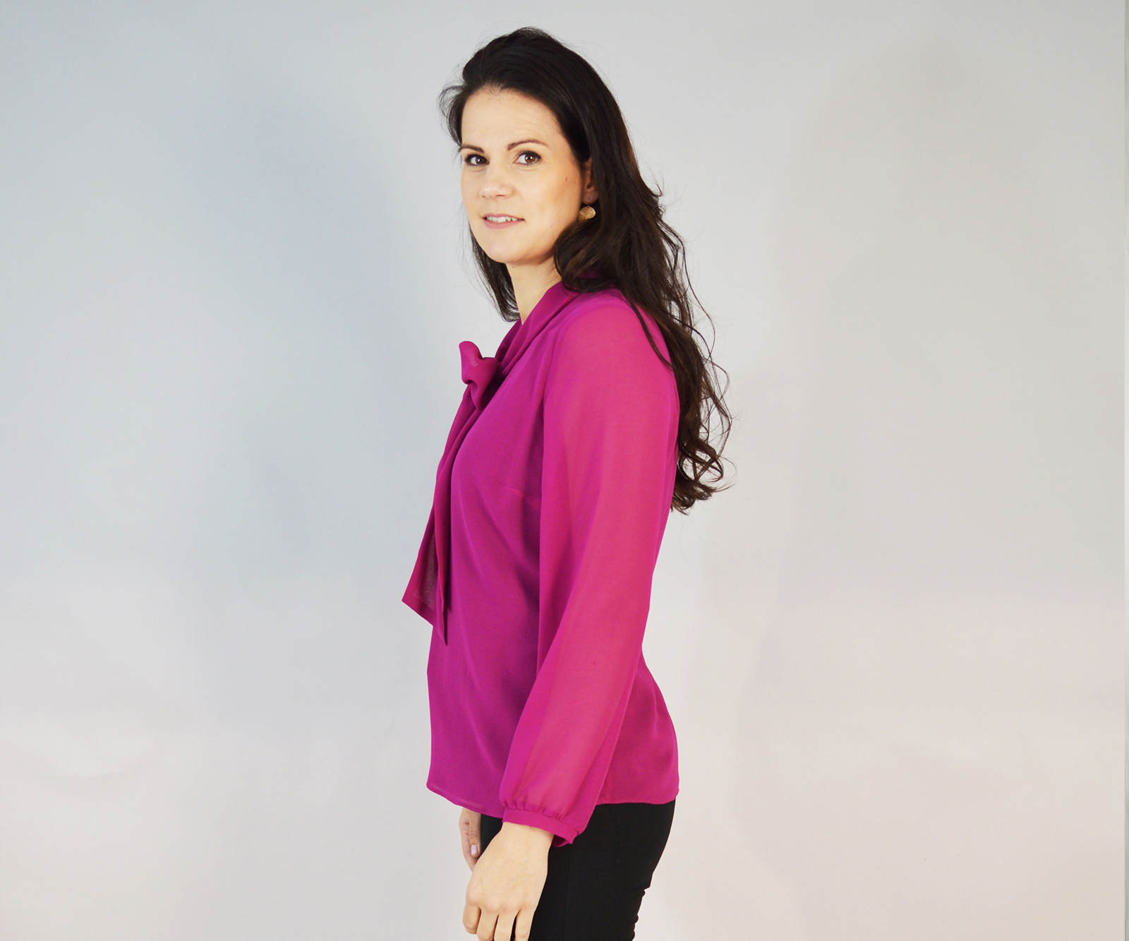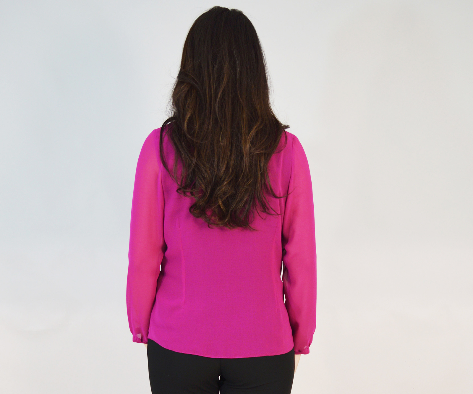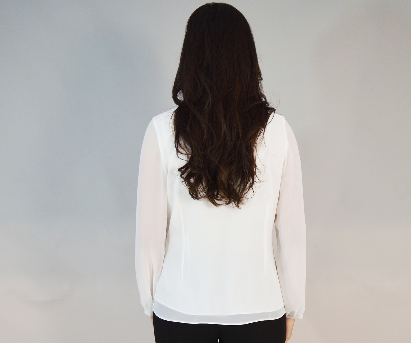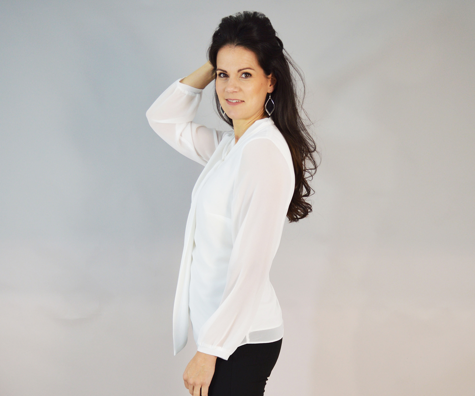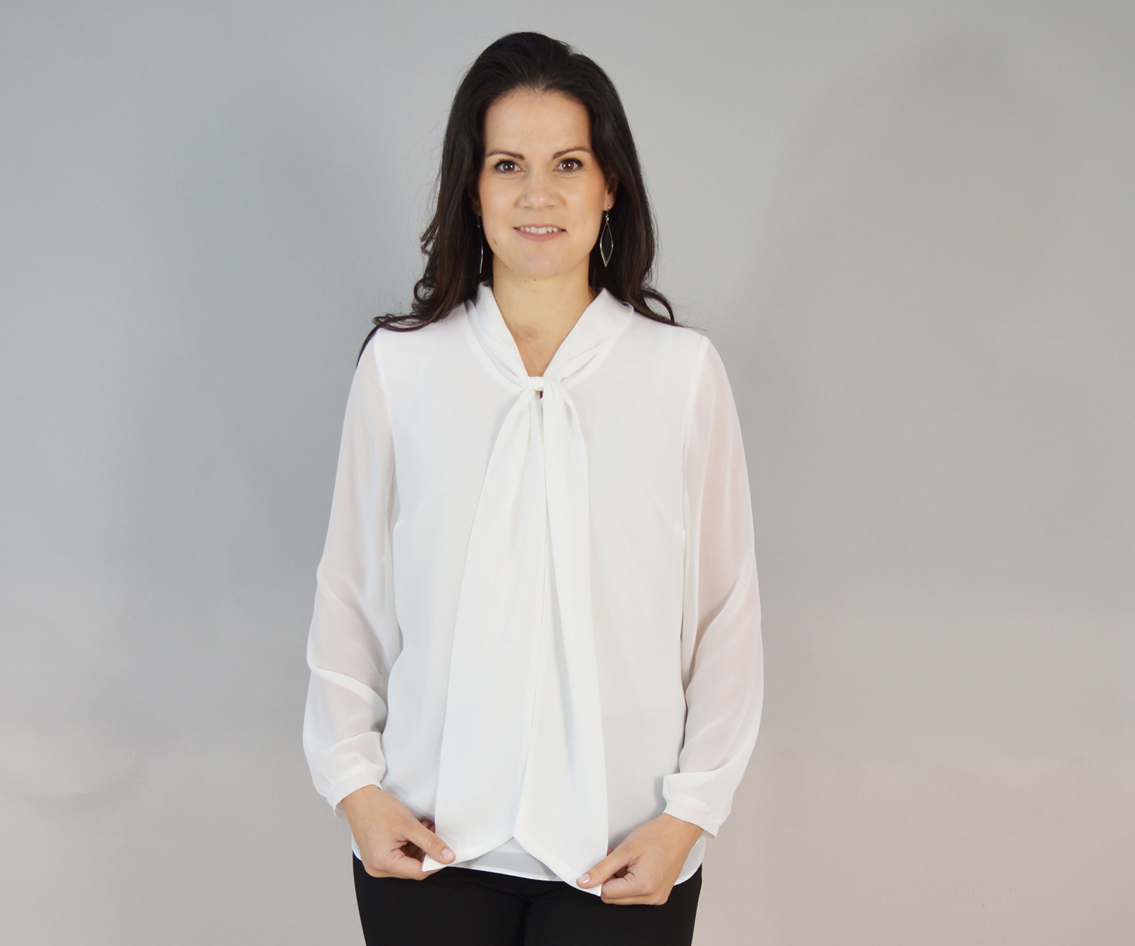 Elegantna bluza dugih rukava s vezicama pomoću kojih možete kreirati ukras od kragne po vlastitom izboru. Odličan je odabir za svečane prilike uz profinjene hlače ili suknju.