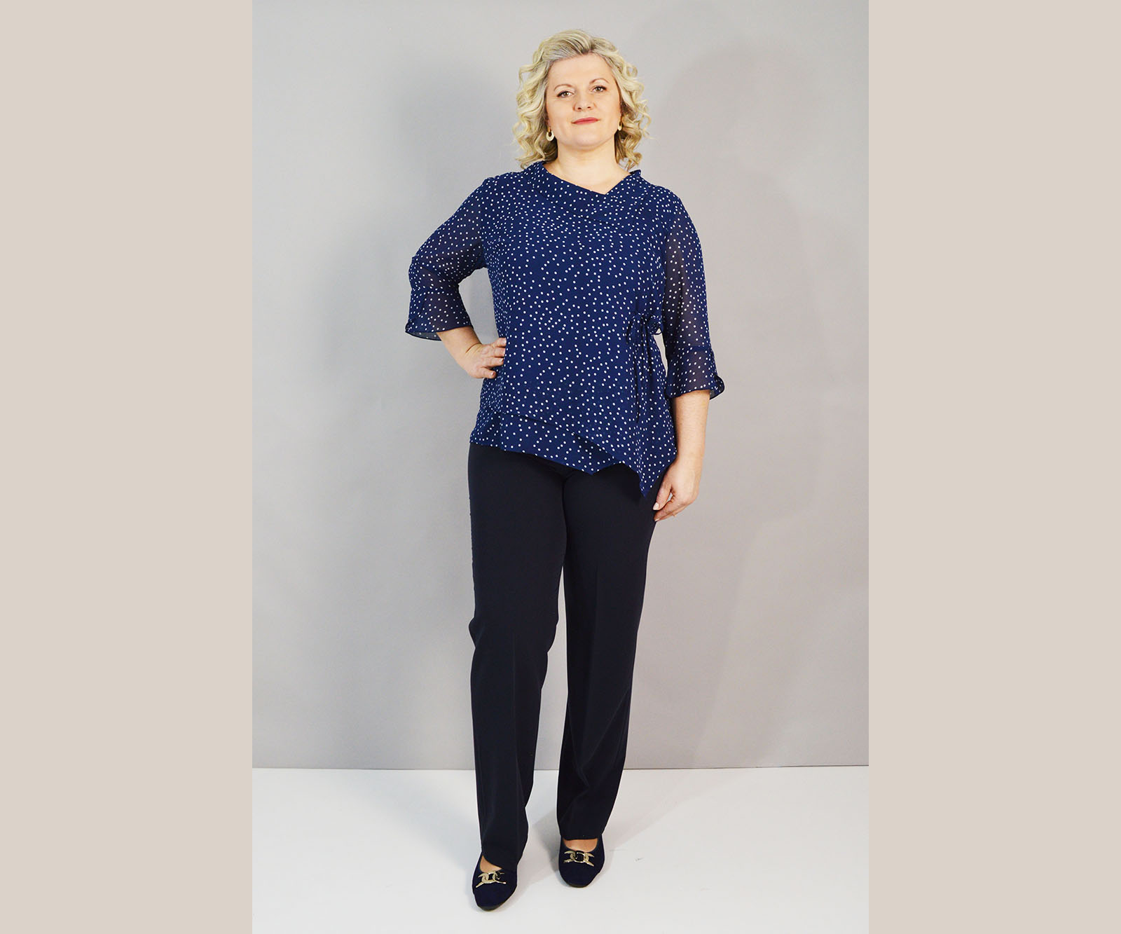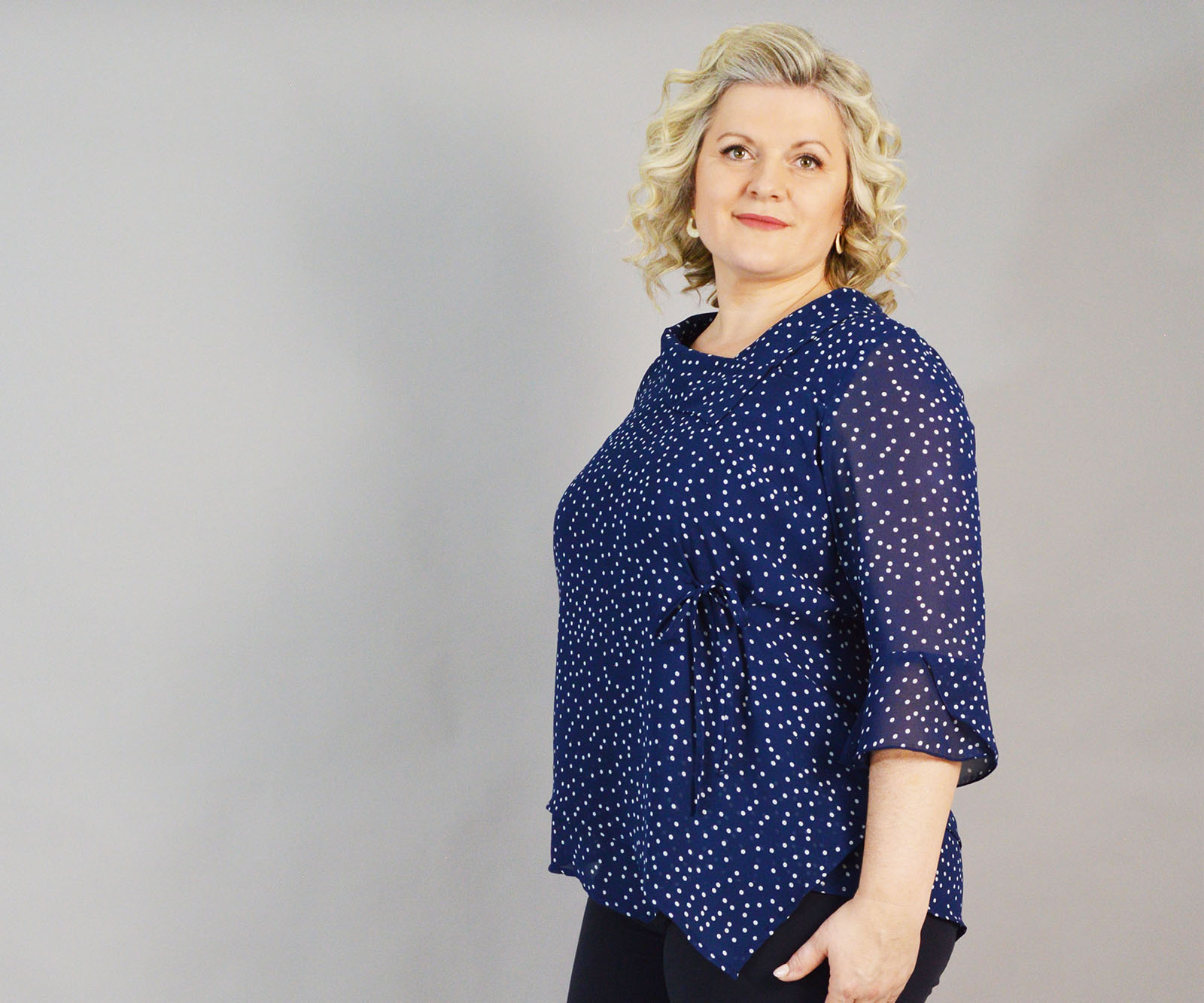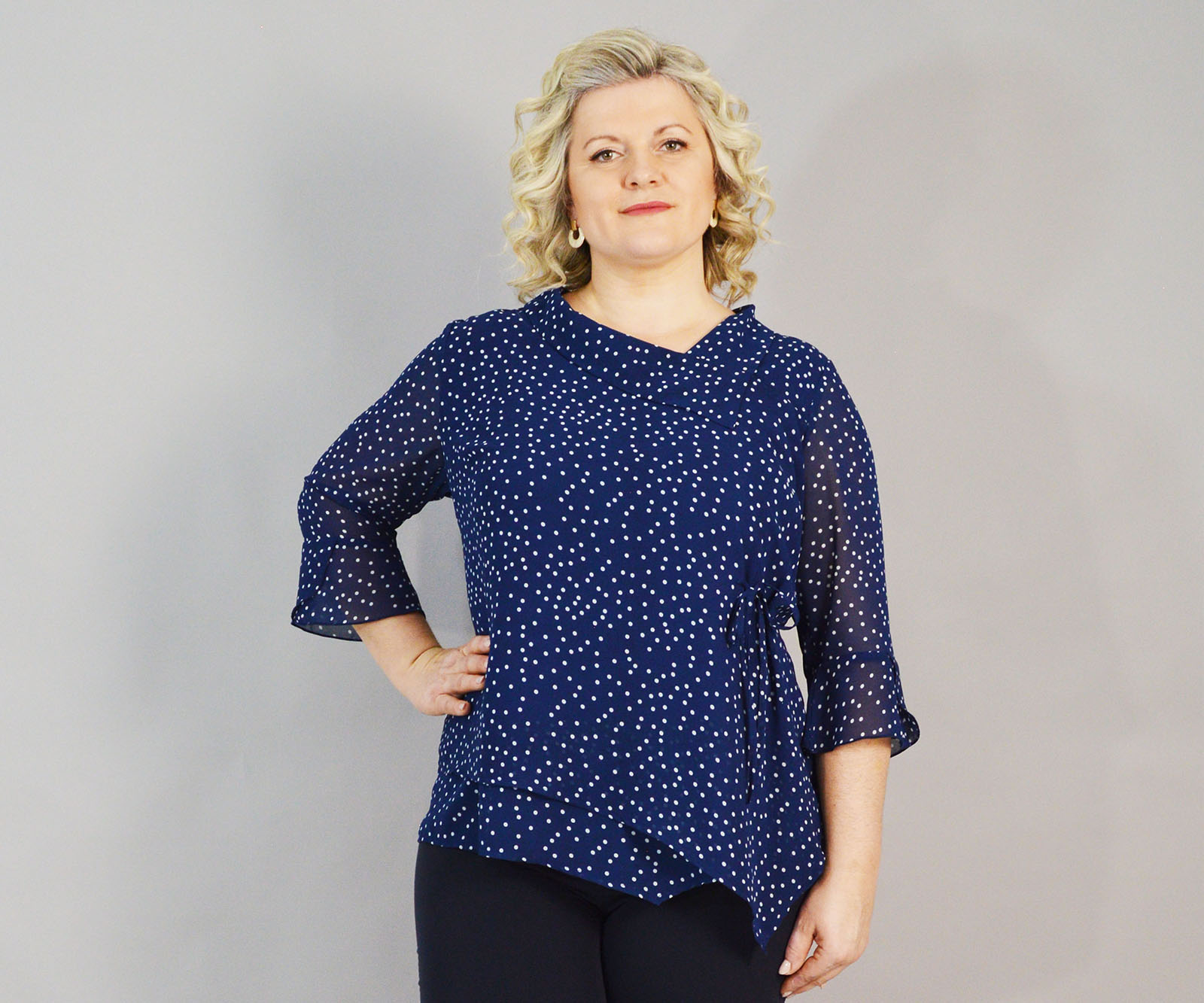 Elegantna bluza Dika odličan je odabir za sve prilike u kojima želite zablistati i osjećati se ugodno u onome što nosite. Plavo/bijeli točkasti uzorak nikada ne izlazi iz mode. Asimetrični kroj i vezica u struku čine je posebnom.