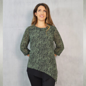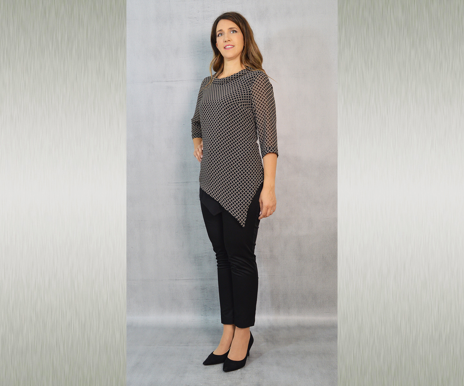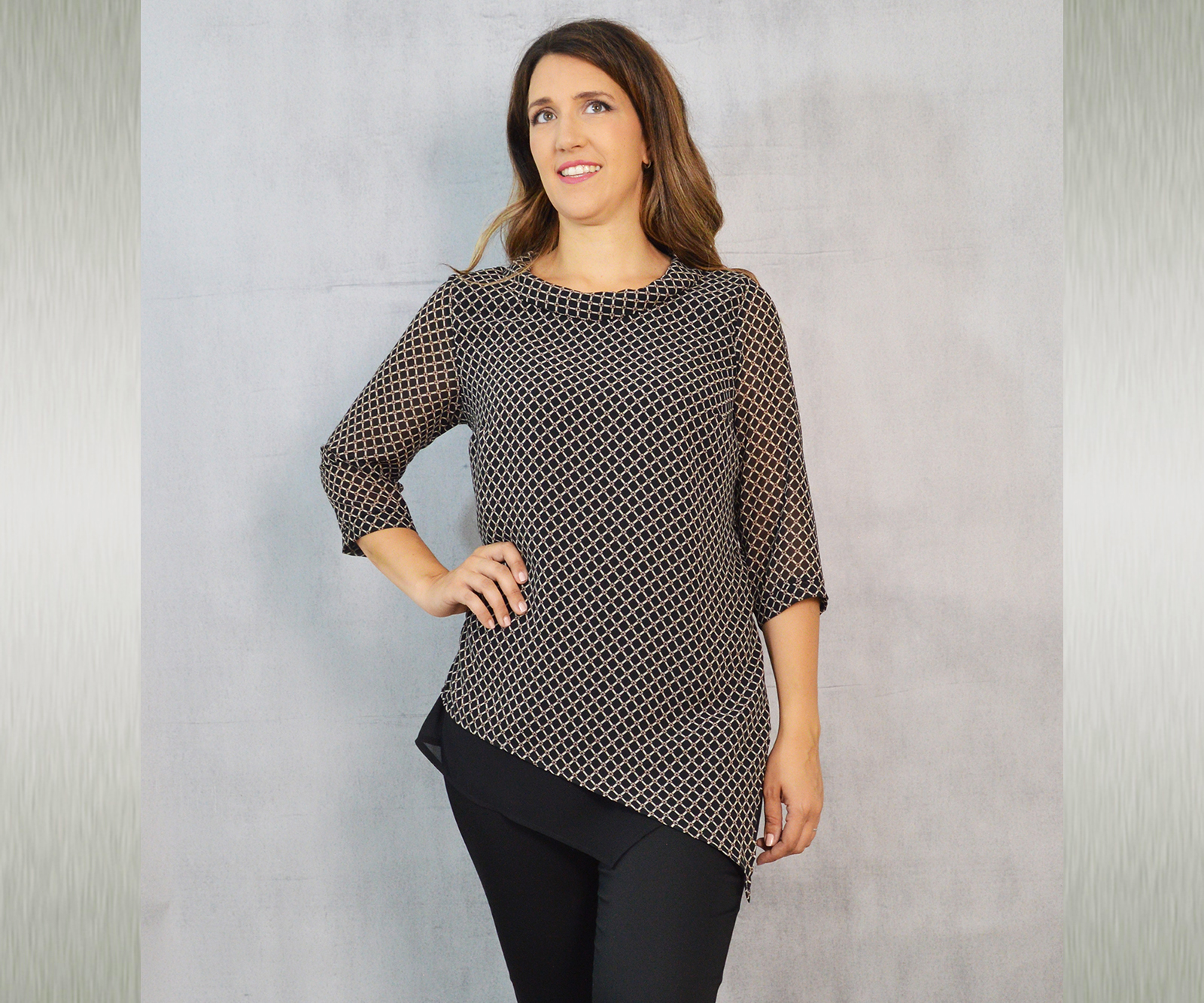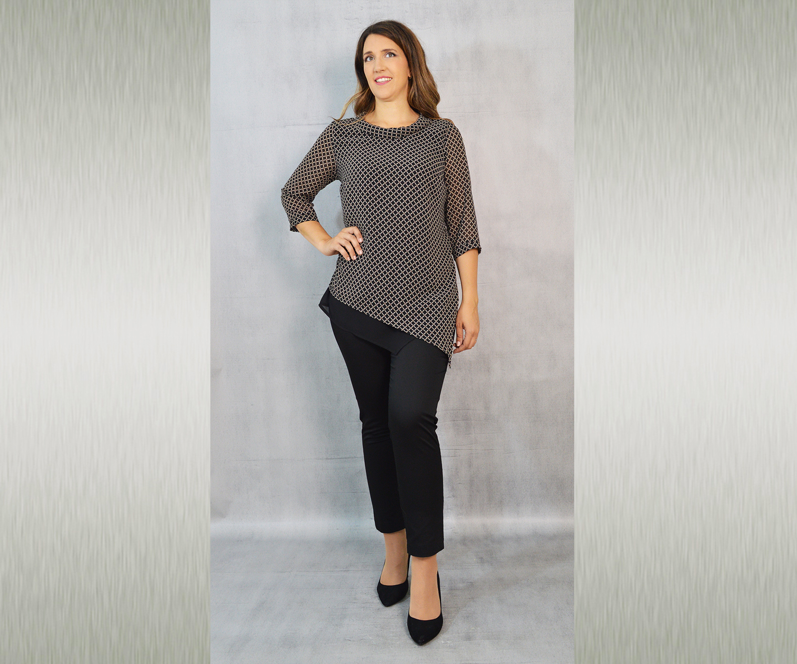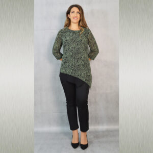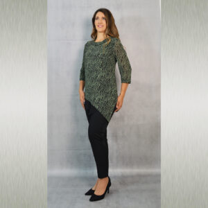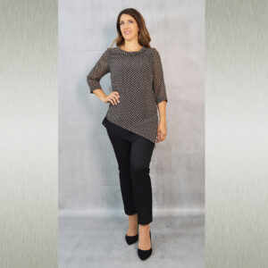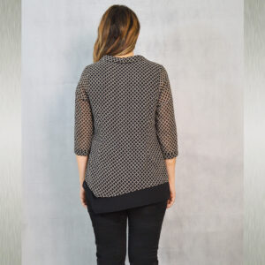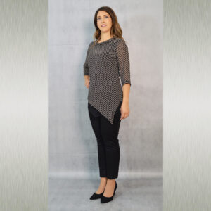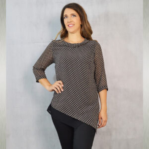 Elegantna tunika dostupna u tri varijante, vrlo profinjene kombinacije uzorka i crne jednobojne tkanine. Savršeno će pristajati uz svečane hlače koje možete pronaći u našoj ponudi u različitim modelima.