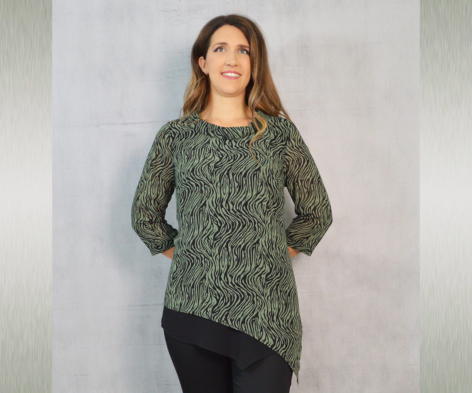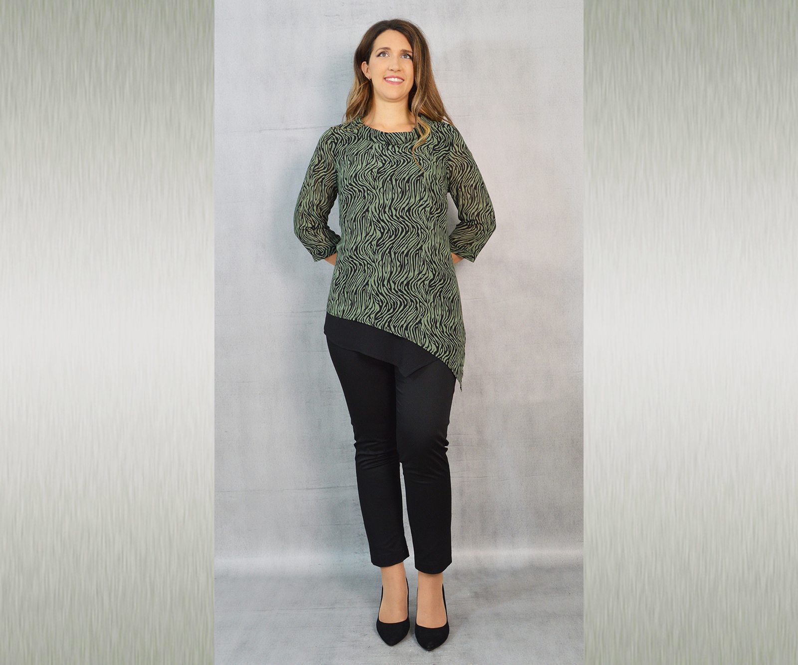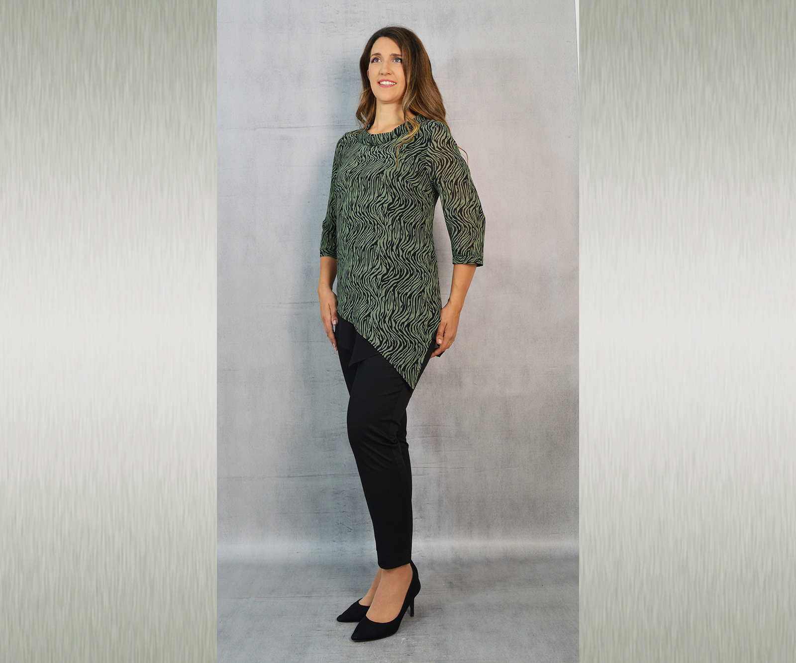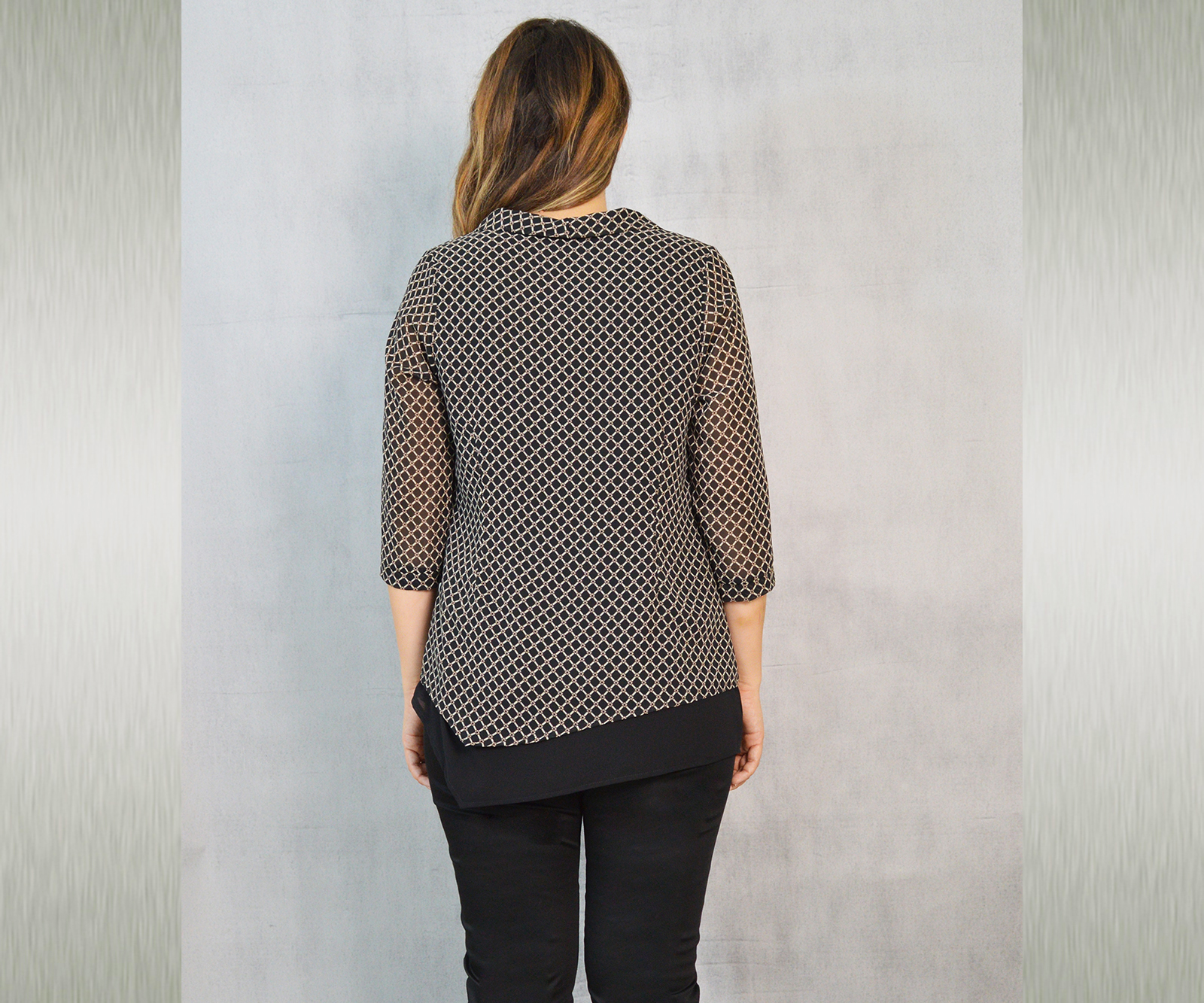 Elegantna tunika dostupna u tri varijante, vrlo profinjene kombinacije uzorka i crne jednobojne tkanine. Savršeno će pristajati uz svečane hlače koje možete pronaći u našoj ponudi u različitim modelima.