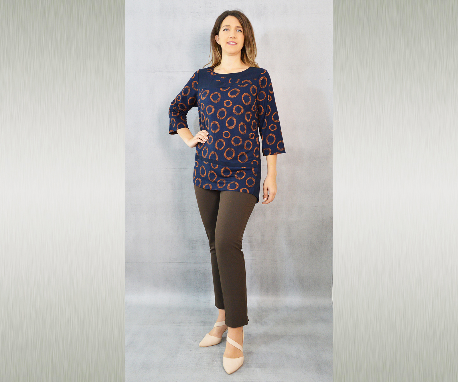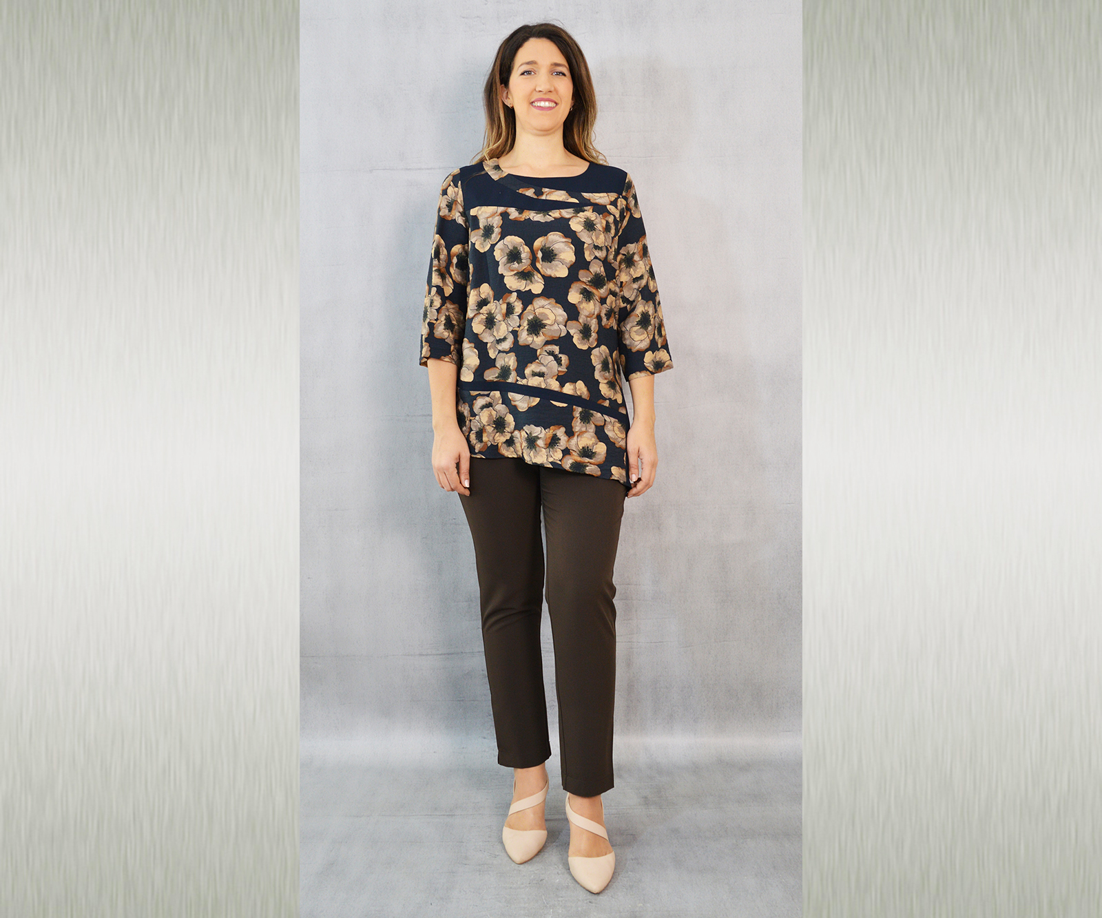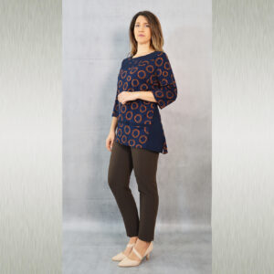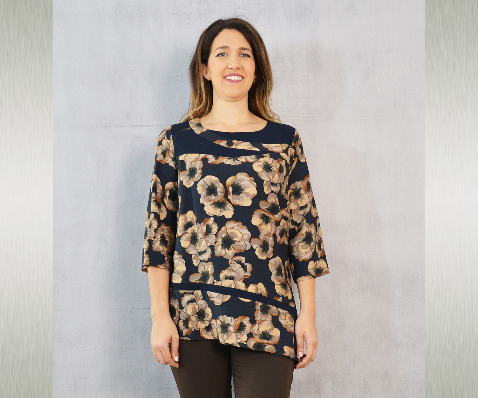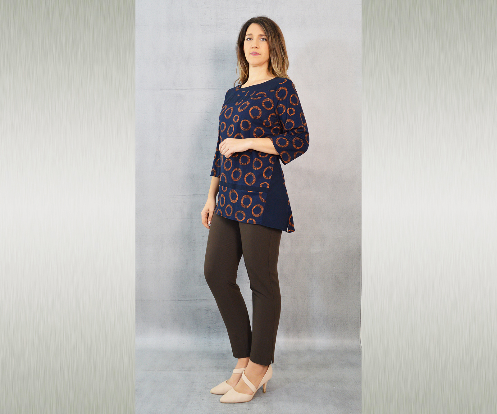Tunika Milica dostupna je u tri uzorka u kombinaciji s jednobojnom tamnoplavom tkaninom. Asimetričnog je kroja i savršen odabir za svakodnevne poslovne prilike te sve one u kojima se želite osjećati ugodno. Napravljena je od kvalitetne viskoze i lako se može kombinirati uz tamnoplave ili smeđe svečane hlače koje također možete pronaći u našoj ponudi u brojnim modelima.