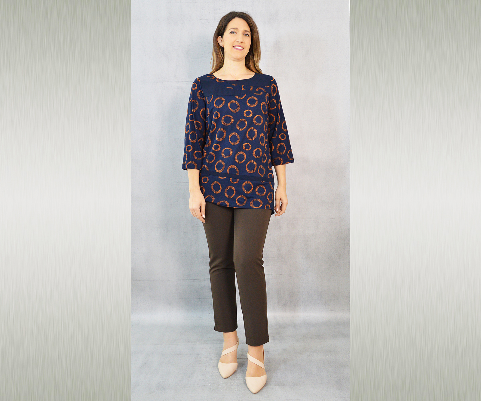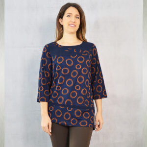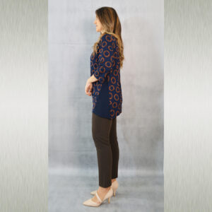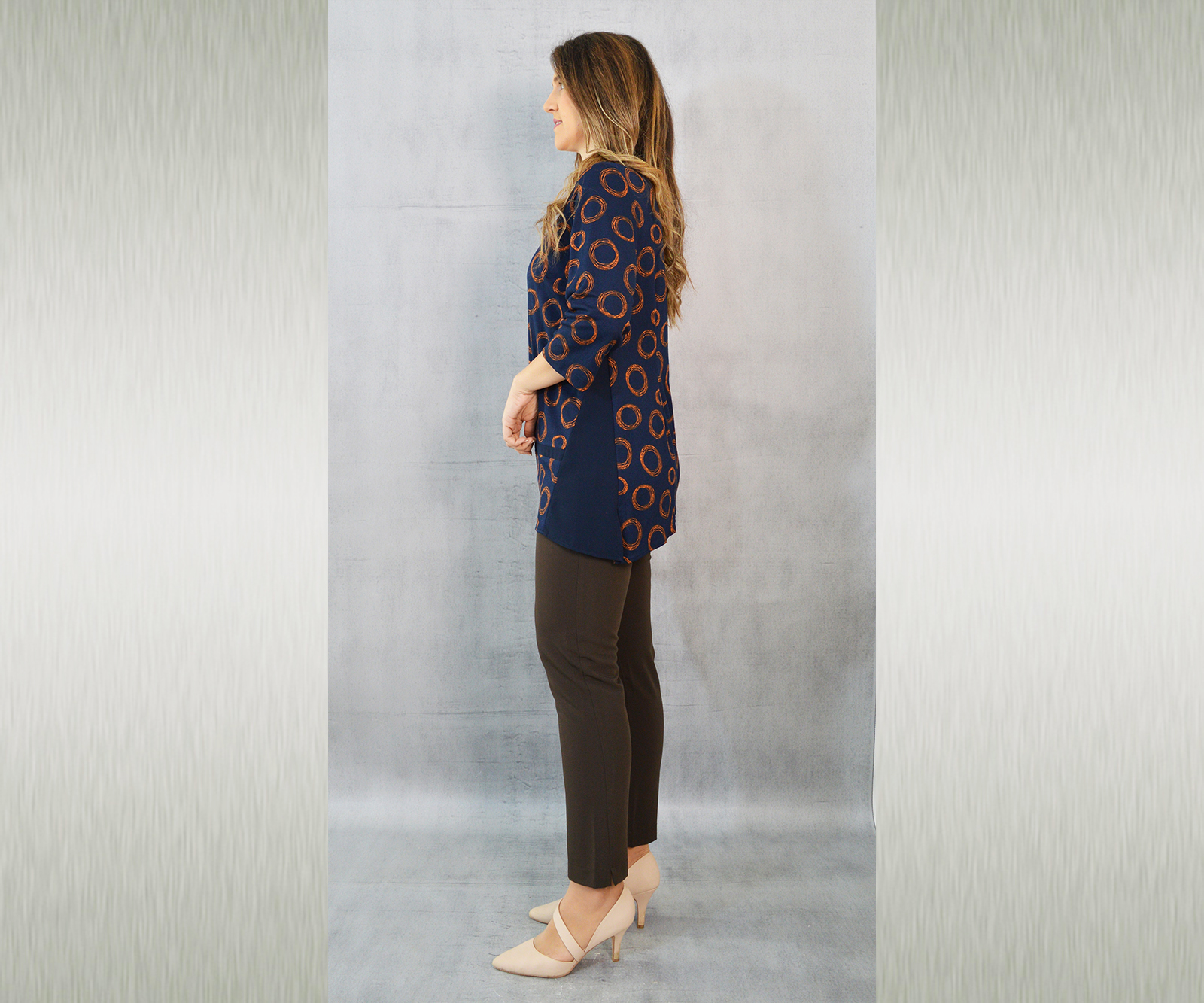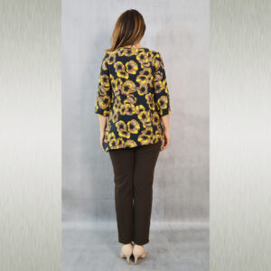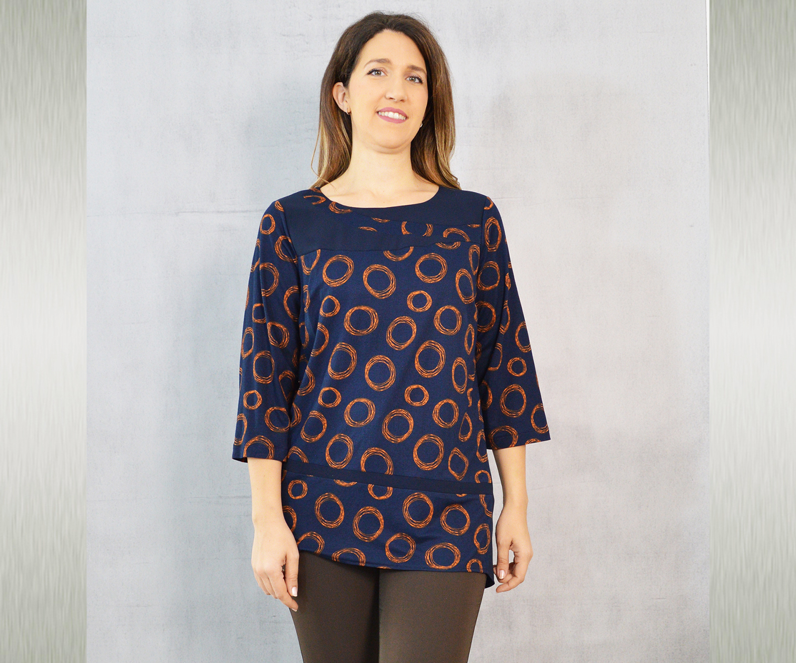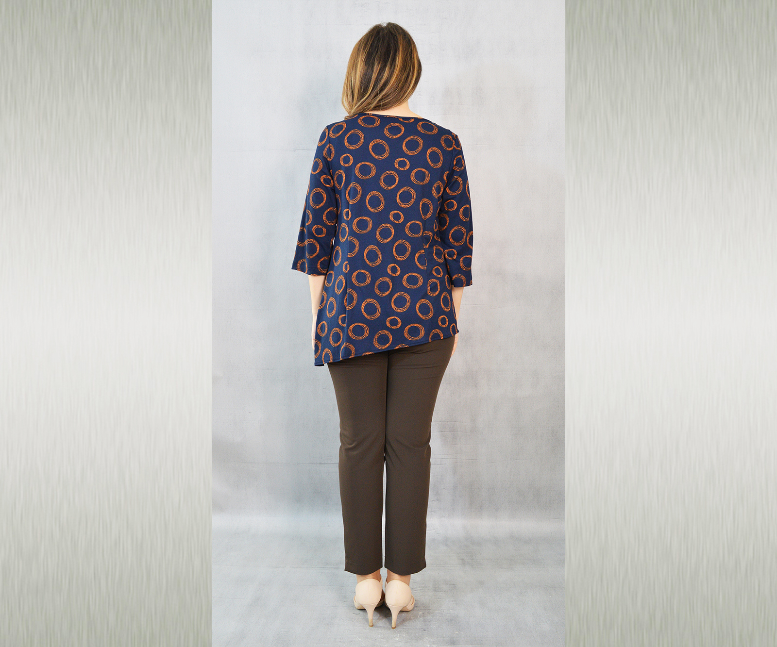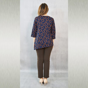 Tunika Milica dostupna je u tri uzorka u kombinaciji s jednobojnom tamnoplavom tkaninom. Asimetričnog je kroja i savršen odabir za svakodnevne poslovne prilike te sve one u kojima se želite osjećati ugodno. Napravljena je od kvalitetne viskoze i lako se može kombinirati uz tamnoplave ili smeđe svečane hlače koje također možete pronaći u našoj ponudi u brojnim modelima.