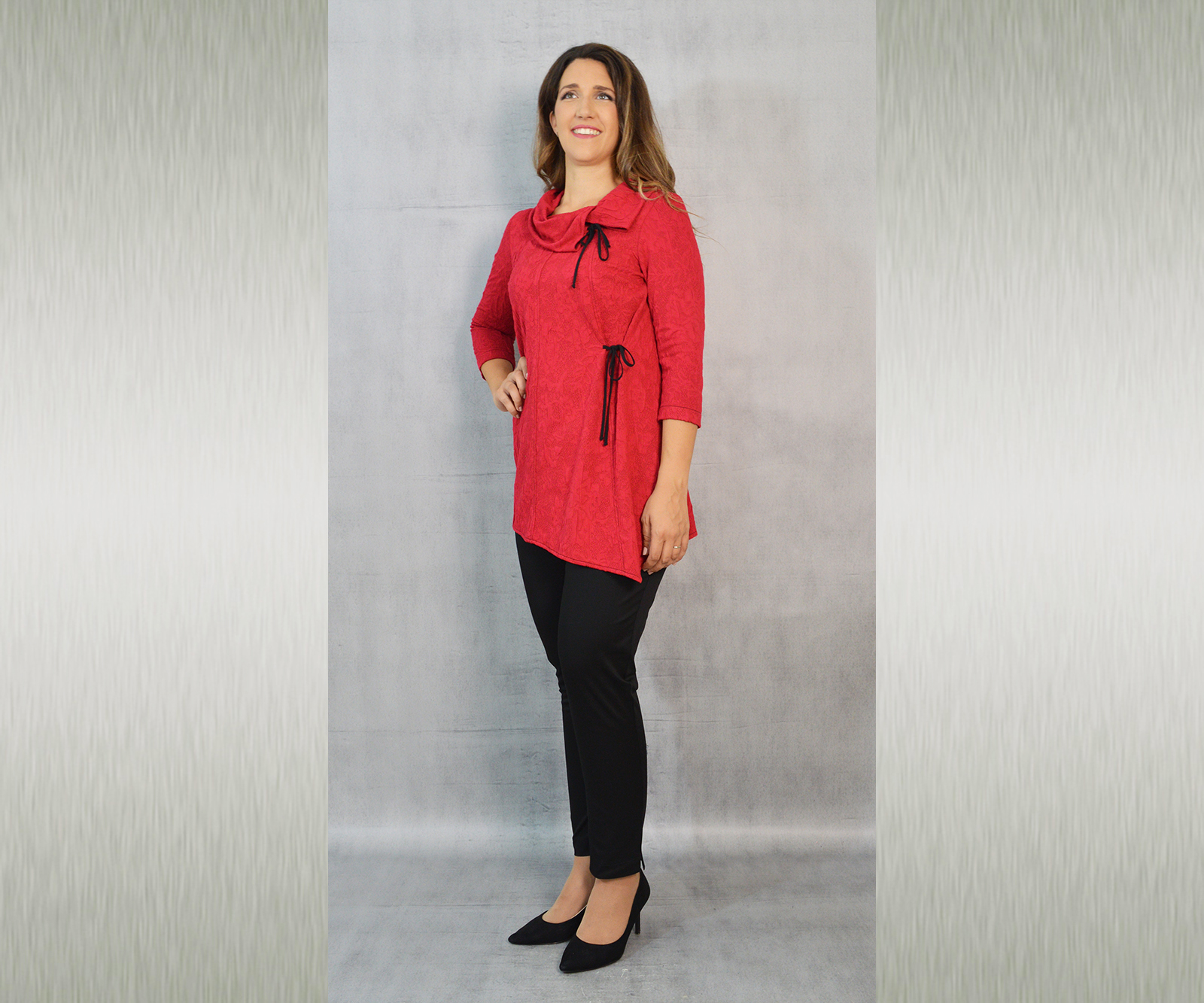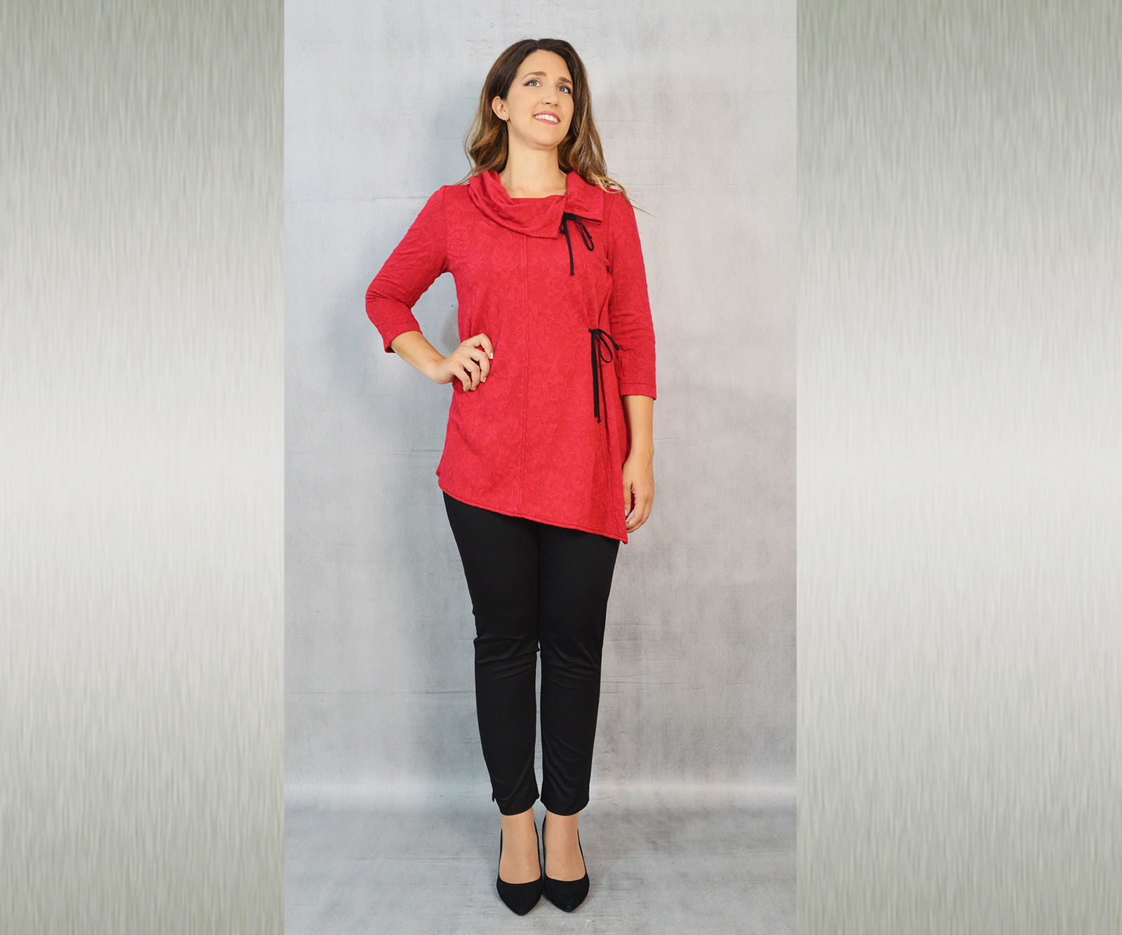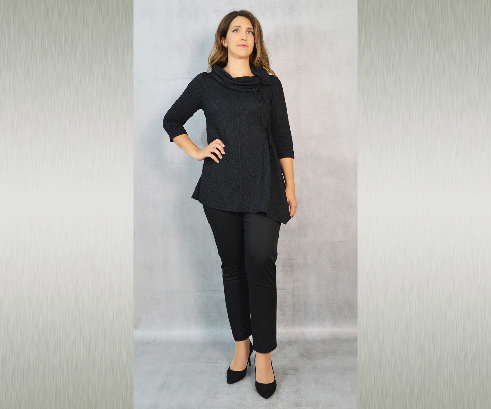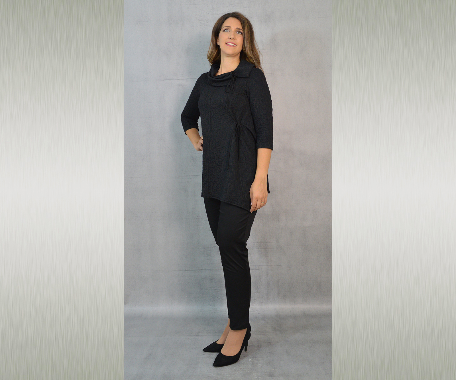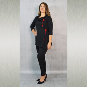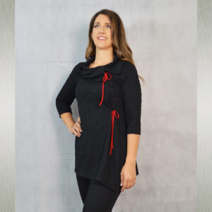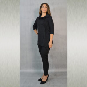Tunika Vjera asimetričan je model idealan za toplije dane. Napravljena je od ugodnog materijala i savršeno će pristajati uz elegantnije hlače. Rukavi duljine 3/4 daju joj na profinjenosti. Ima po dvije vezice, jednu pri kragni, a drugu u struku.